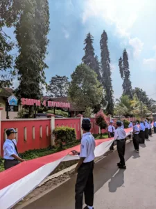 Bentangkan bendera merah putih sepamnjang 130 meter di halaman SMPN 4 Kutasari