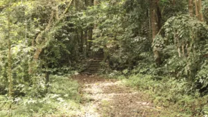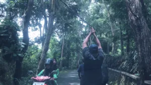Memasuki Gua Rahayu pun membutuhkan kewaspadaan ekstra: jalan curam, lembap, dan gelap. Meski demikian, pesona petualangan dan spiritual tetap memikat. Nampak sekelompok siswa SMAN 2 Cilacap melintas sambil menikmati rimbunnya hutan.