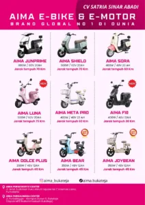 Sepeda listrik: Aima Joybean (Rp 3.200.000), Aima Bear (Rp 3.600.000), Aima Dolce Plus (Rp 4.000.000), Aima F10 (Rp 4.600.000), Aima Metapro (Rp 5.500.000), Aima Sora (Rp 7.000.000), Aima Shield (Rp 7.800.000), dan Aima Junprime (Rp 8.800.000).