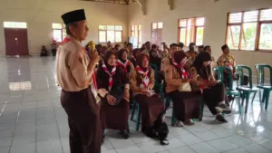 “Gunakan kesempatan ini untuk saling berbagi. Jika ada hal yang perlu ditanyakan, silakan ditanyakan kepada narasumber. Saya yakin kegiatan ini bermanfaat, maka ikutilah dengan sebaik-baiknya,” ujarnya.Salah satu narasumber  Riono, S.Pd. Waka Bina Wasa Kwarran Purbalingga / Anggota Pelatih Kwarcab Purbalingga sedang menyampaikan materi tentang Mengelola Satuan