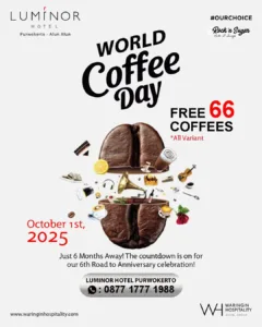 “Perayaan World Coffee Day ini kami hadirkan sebagai bentuk apresiasi kepada para tamu setia. Kami ingin menciptakan pengalaman berkesan sekaligus berbagi kebahagiaan dalam perjalanan menuju ulang tahun ke-6 Luminor Hotel Purwokerto,” ungkap General Manager Luminor Hotel Purwokerto Rio Nofiando Atje.
