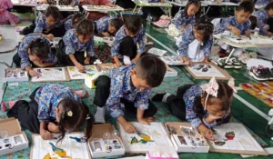 Sebanyak 122 peserta didik dari TK Pertiwi se-Kecamatan Karangmoncol mengikuti kegiatan membatik yang didampingi oleh 44 guru. Anak-anak tampak antusias mencoretkan motif hingga mengisi warna di atas kain.
