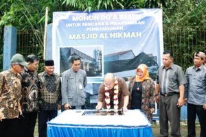 Bupati Banyumas Sadewo menandai prasasti dimulainya pembangunan Masjid Al Hikmah di kompleks SMK TI Bintra Purwokerto.