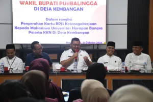 PURBALINGGA, EDUKATOR — Wakil Bupati Purbalingga, Dimas Prasetyahani, memberikan perlindungan BPJS Ketenagakerjaan kepada 36 mahasiswa Universitas Harapan Bangsa (UHB) Purwokerto yang sedang melaksanakan praktik profesi (Co Ners) di Desa Kembangan, Kecamatan Bukateja. Penyerahan kartu BPJS Ketenagakerjaan dilakukan di Aula Desa Kembangan, Selasa (21/10/2025).Wabup Purbalingga Dimas Prasetyahani bersama peserta yang hadir di Balai Desa Kembangan, Kecamatan Bukateja.