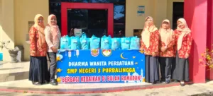 PURBALINGGA, EDUKATOR–Mengisi kegiatan bulan suci Ramadan 1447 Hijriah, Dharma Wanita Persatuan (DWP) SMP Negeri 3 Purbalingga menggelar kegiatan bakti sosial dengan membagikan puluhan paket sembako kepada masyarakat kurang mampu di sekitar sekolah. Juga dibagikan kepada sejumlah murid serta tenaga kebersihan sekolah. Kegiatan tersebut dilaksanakan pada Sabtu (14/3/2026) di SMP Negeri 3 Purbalingga.
