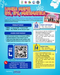 Pendaftaran lomba dibuka secara online mulai 17 Januari hingga 7 Februari 2026, dengan biaya Rp 150.000 per tim atau per mata pelajaran. Informasi lengkap serta pendaftaran dapat diakses melalui tautan Lomba IPA, IPS, dan Matematika SMP Tahun 2026