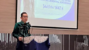 PURBALINGGA, EDUKATOR–Fakultas Teknik Universitas Jenderal Soedirman (FT Unsoed) menggelar halalbihalal 1447 Hijriah di Auditorium FT Unsoed, Jumat (27/3/2026. Dalam kegiatan bertema “Dari Madrasah Ramadhan Menuju Kampus yang Penuh Keberkahan” ini, tausyiah disampaikan oleh Dr Ir H Nurul Hidayat SPt, M.Kom, yang juga Wakil Dekan III FT Unsoed.