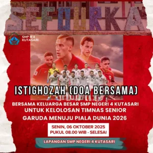PURBALINGGA, EDUKATOR–Keluarga besar SMP Negeri 4 Kutasari akan menggelar istighozah (doa bersama) sebagai bentuk dukungan agar Timnas Senior Garuda dapat lolos menuju  ke Piala Dunia 2026. Acara ini dijadwalkan pada Senin (6/10/2025) 2025, mulai pukul 08.00 WIB di lapangan SMPN 4 Kutasari.