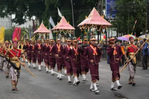 Empat pusaka kebesaran daerah diarak dengan penuh khidmat, menyedot perhatian masyarakat yang memadati sisi jalan.