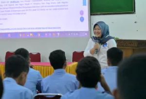 Kepala Bidang Pengelolaan Informasi dan Komunikasi Publik Dinkominfo Banjarnegara, Dhian Budi Asih, S.IP, M.Si saat sosialisisasi bija bermedsos di  SMKN 1 Bawang, Rabu (21/1/2026). (Foto: Muji Prast/EDUKATOR)
