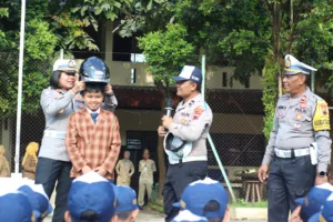 Kasat Lantas Polres Purbalingga AKP Gharasa Zahra Zahirah mengenakan helm kepada salah satu murid SMPN 1 Purbalingga. (Foto: Humas Polres Purbalingga/EDUKATOR)