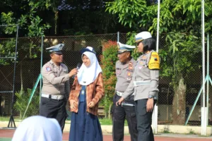 PURBALINGGA, EDUKATOR — Kasat Lantas Polres Purbalingga AKP Gharasa Zahra Zahirah menjadi inspektur upacara di SMP Negeri 1 Purbalingga, Senin (9/2/2026). Dalam kegiatan yang menjadi bagian dari Operasi Keselamatan Candi 2026 itu, ratusan murid diingatkan pentingnya disiplin berlalu lintas, terutama penggunaan helm Standar Nasional Indonesia (SNI).
