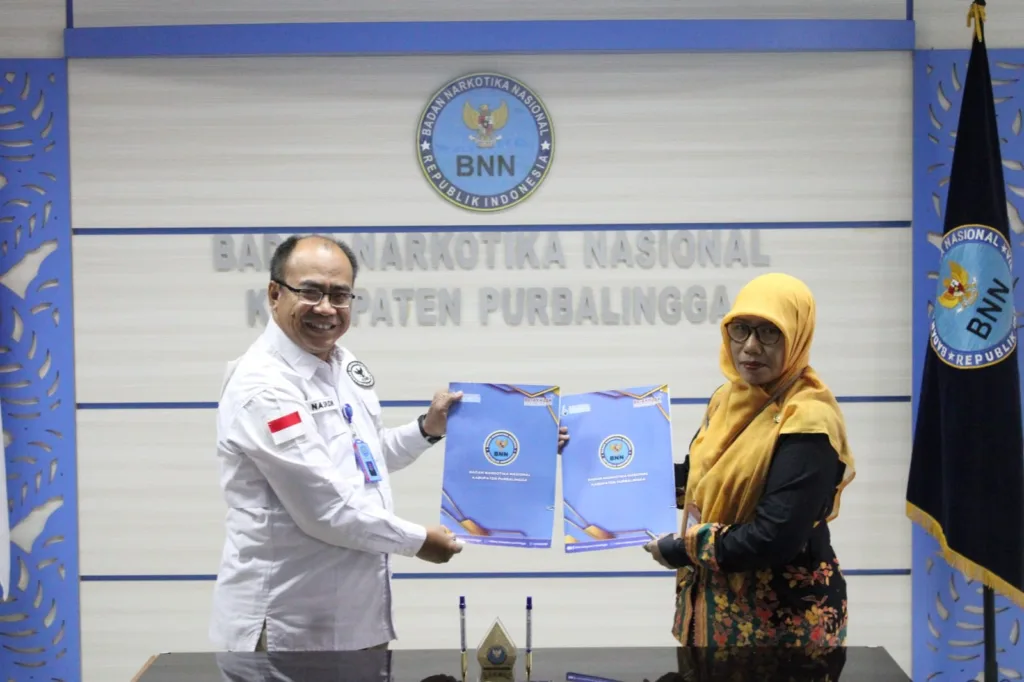 Kepala BNNK Purbalingga, Dr. H. Nasrudin, S.Ag., M.M.Pd., bersama Kepala MTs Ma’arif NU 08 Panican Misriyah, S.Ag menunjukan surat perajanjian kerja sama. (Foto: Humas BNN Purbalingga/EDUKATOR) PURBALINGGA, EDUKATOR — Badan Narkotika Nasional Kabupaten (BNNK) Purbalingga memperkuat upaya Pencegahan dan Pemberantasan Penyalahgunaan dan Peredaran Gelap Narkotika (P4GN) di lingkungan pendidikan melalui penandatanganan Perjanjian Kerja Sama dengan […]