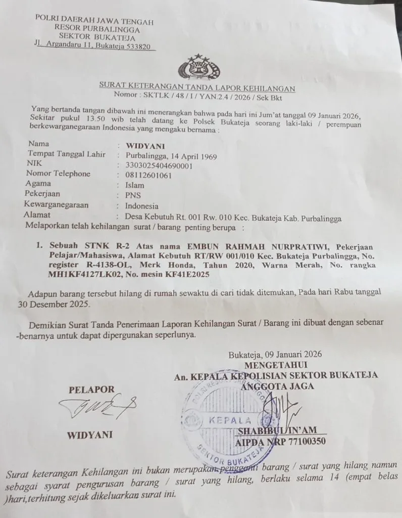 Warga Purbalingga “Embun Rahmah Nurpratiwi” Kehilngan STNK