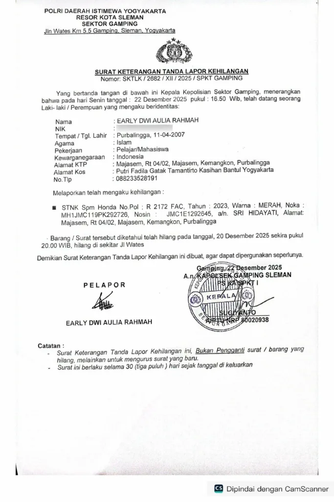 Warga Purbalingga Early Dwi Aulia Rahmah Kehilangan STNK di Jogja