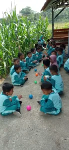 Salah satu siswa, Hasbi Putra Nur Fahmi, tampak antusias menikmati segarnya air sungai bersama teman-temannya. “Asyik banget, airnya dingin!” katanya dengan wajah berbinar.Ice breaking ( siku sakit sikat dg alat peraga bola)