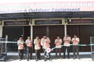 Usai apel besar Pramuka, Wabup Dimas meresmikan Kedai Pramuka “Tunas Perwira” di kompleks Sanggar Pramuka Kwarcab Purbalingga Lor. Kedai ini menyediakan perlengkapan berkemah, rental peralatan outdoor, hingga percetakan. (Prasetiyo)