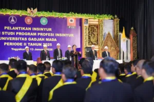 YOGYAKARTA, EDUKATOR–Universitas Gadjah Mada (UGM) Yogyakarta melantik sebanyak 901 insinyur baru pada periode II Tahun 2025 yang berlangsung di Grha Sabha Pramana, Selasa (13/1/2025). Pada periode ini terdapat 762 insinyur baru dari Fakultas Teknik, 104 dari Fakultas Peternakan, dan 35 dari Fakultas Kehutanan. Dengan penambahan jumlah insinyur baru ini maka total jumlah lulusan insinyur UGM sebanyak 7.314 lulusan.