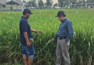 Monitoring dan evaluasi produksi massal benih bersertifikat Inpago Unsoed Protani di PT. SHS oleh pemulia tanaman Unsoed.